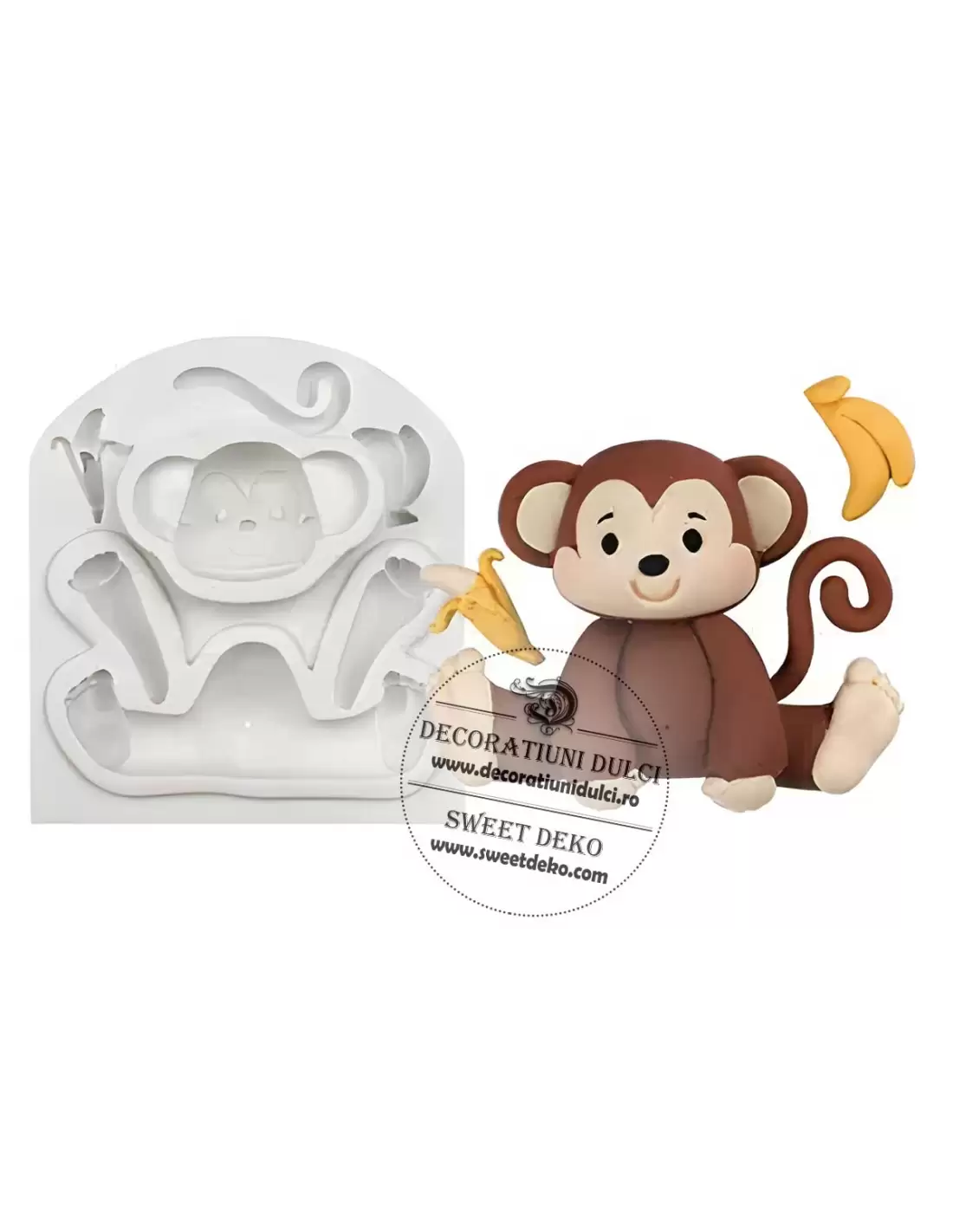 Mulaj maimutica vesela este realizat din silicon alimentar pentru pasta de zahar sau alte materiale modelabile. Capul si labutele din fata sunt separate de corp, astfel ca labutele se pot aseza in pozitia pe care o doriti dvs.