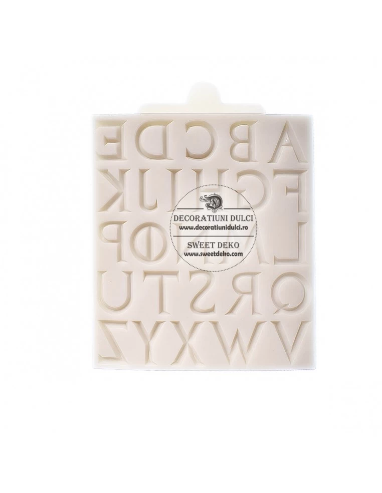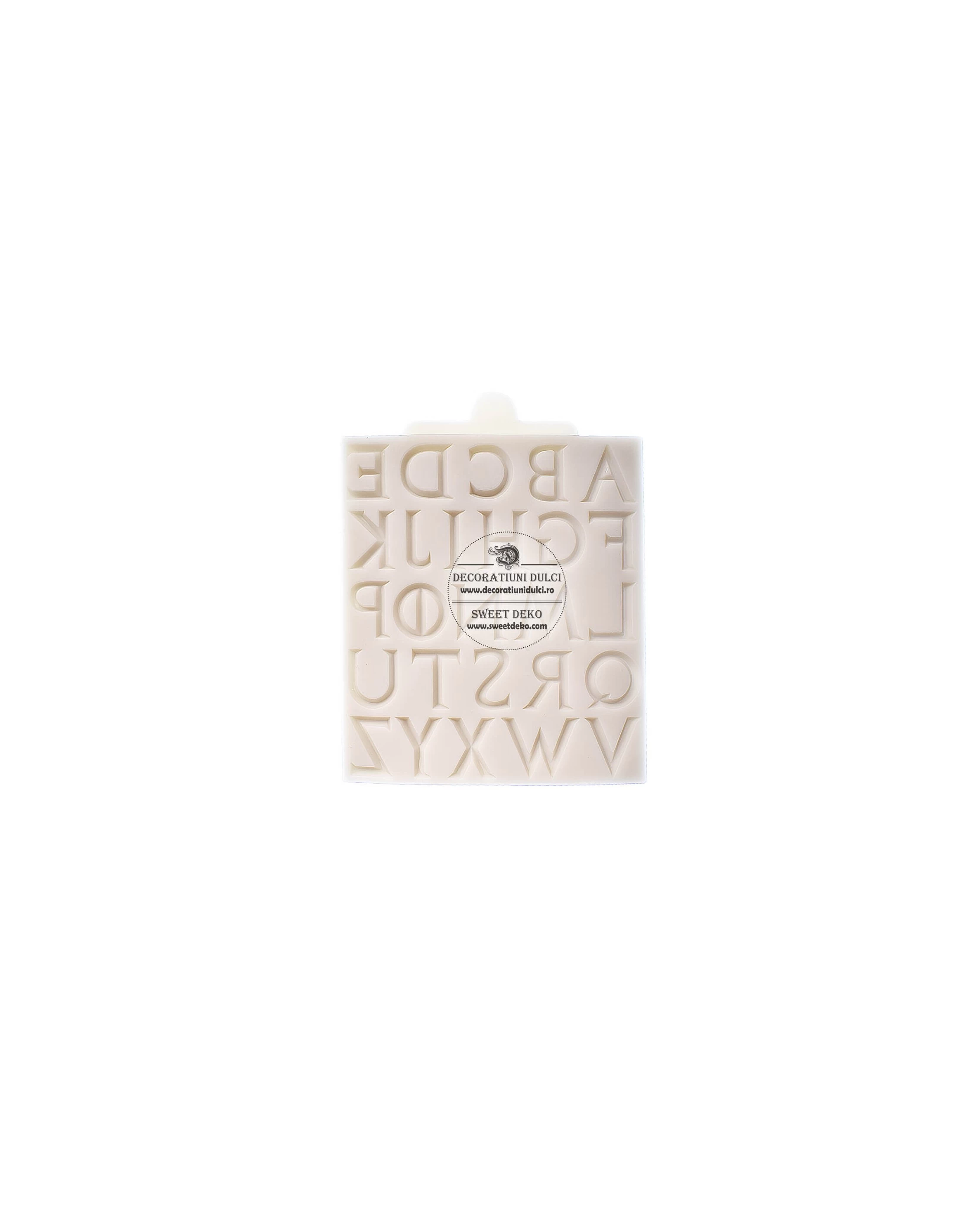 Mulaj din silicon alimentar, ideal pentru a scrie pe torturi mesajele tale dulci. Un font clasic, usor de folosit. Dupa ce asezi pasta de zahar|ciocolata modelabila in cavitatile mulajul, pune-l pentru cetave minute in congelator. Literele se vor scoate foarte usor si nu se vor deforma.