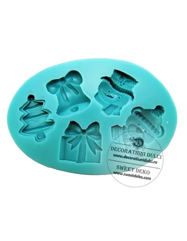 Mulaj din silicon cu 5 forme forma micute, diferite: cadou, brad, om de zapada, ursulet, clopotel