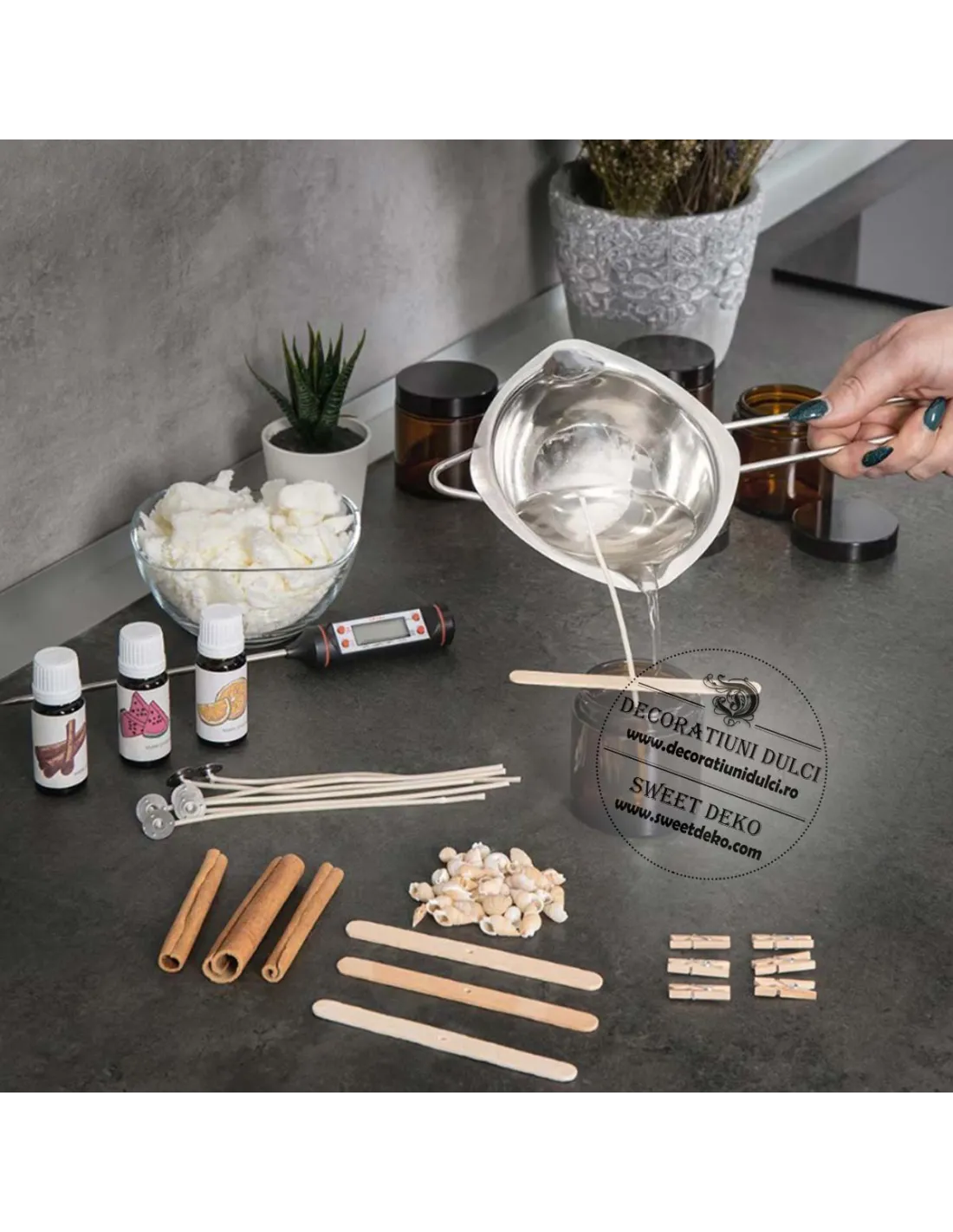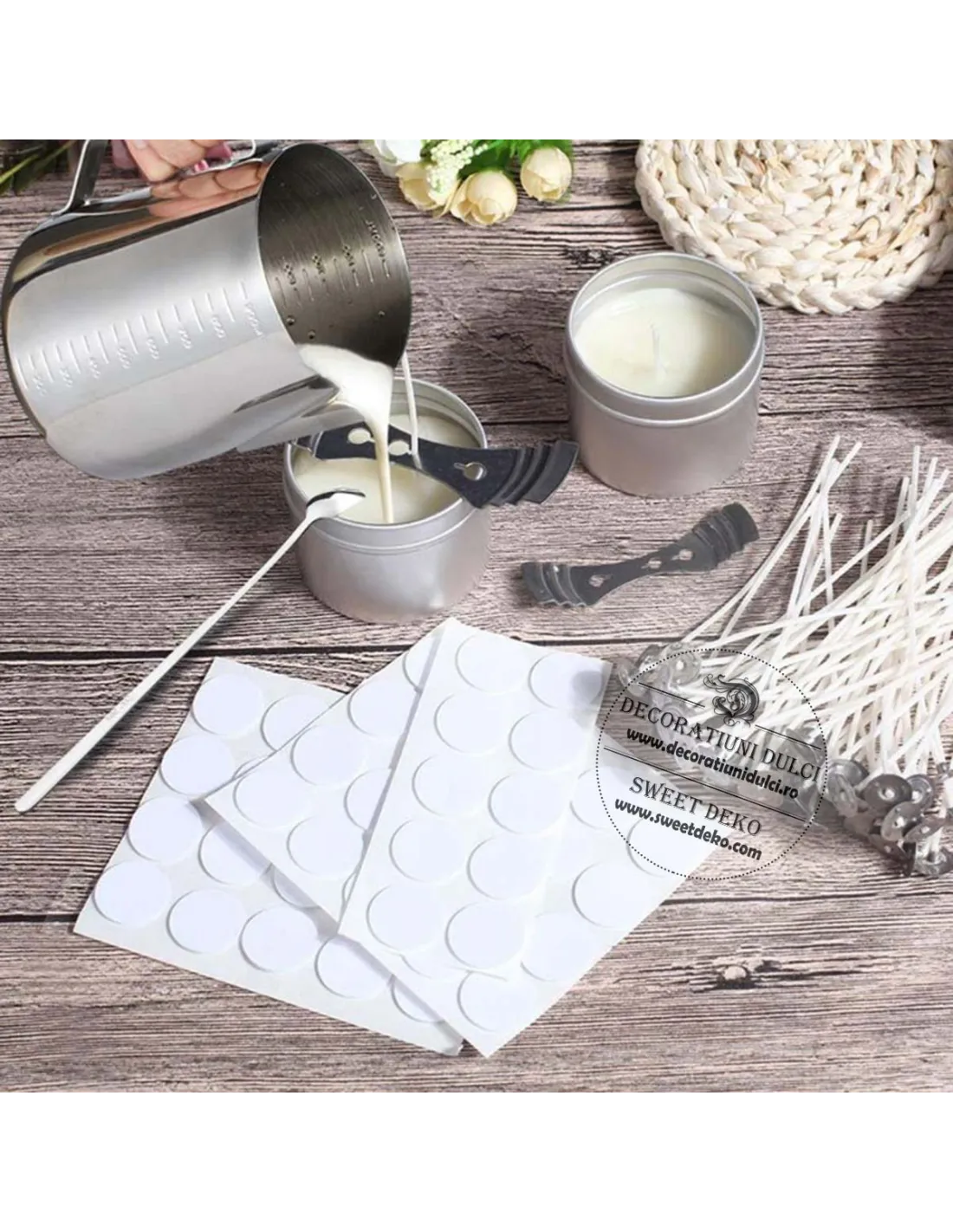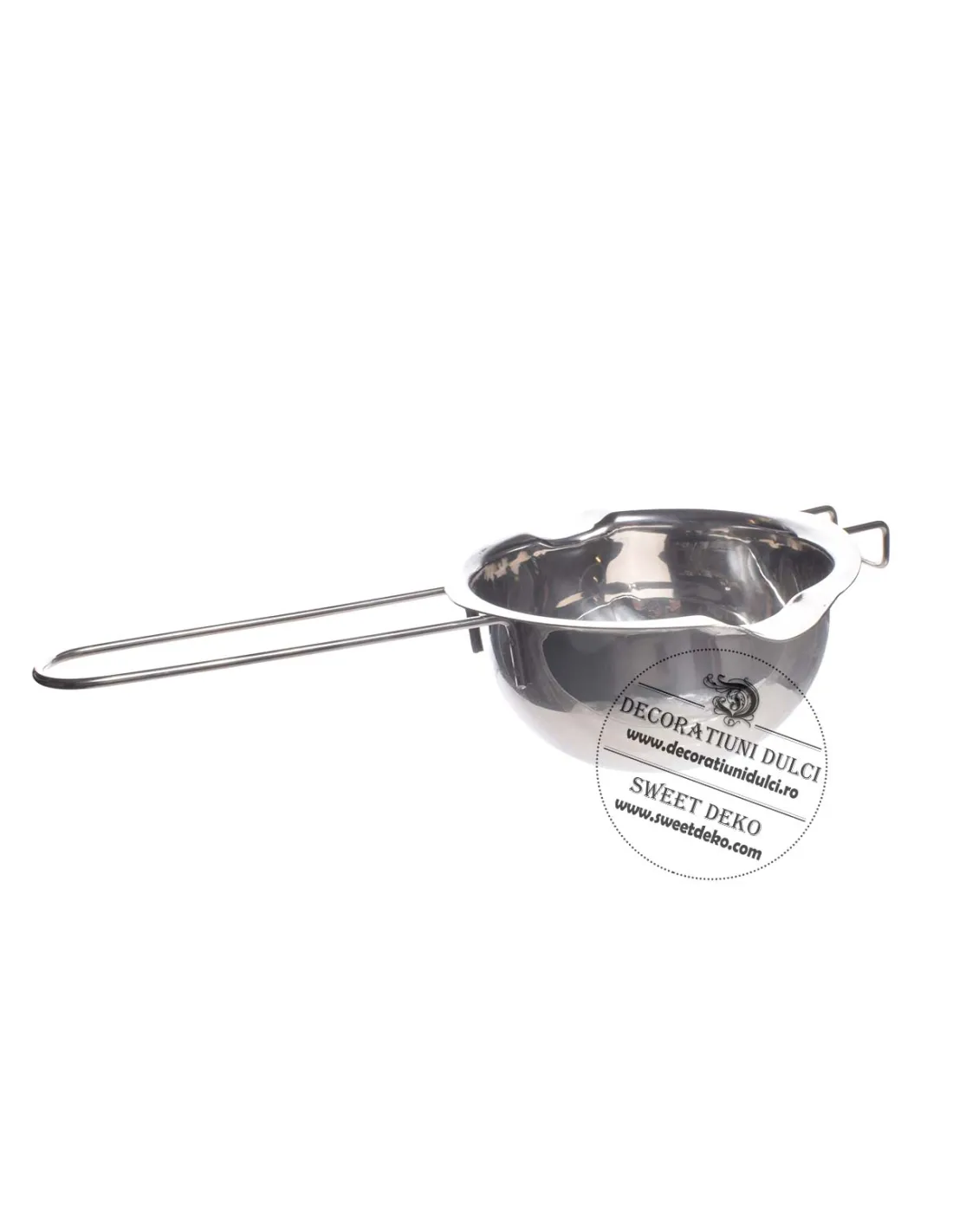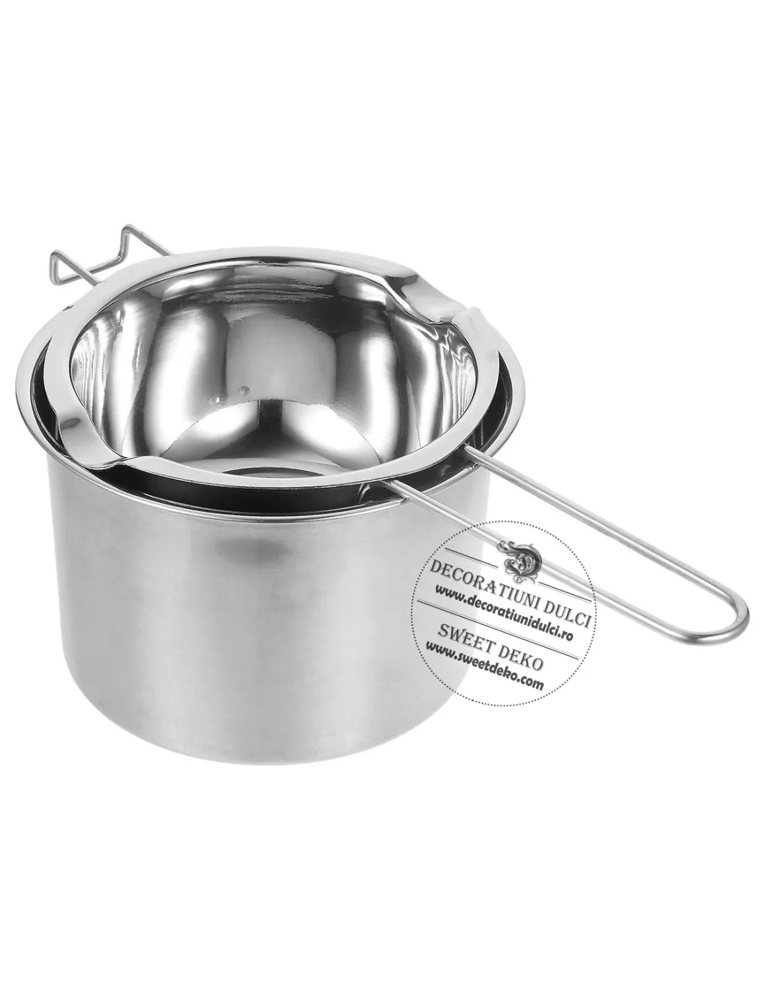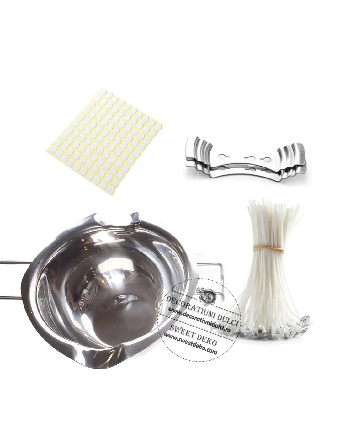 Kit-ul cu bol pentru topit ciocolata contine: un vas din inox, fitile, doua suporturi de fixare si fitile.