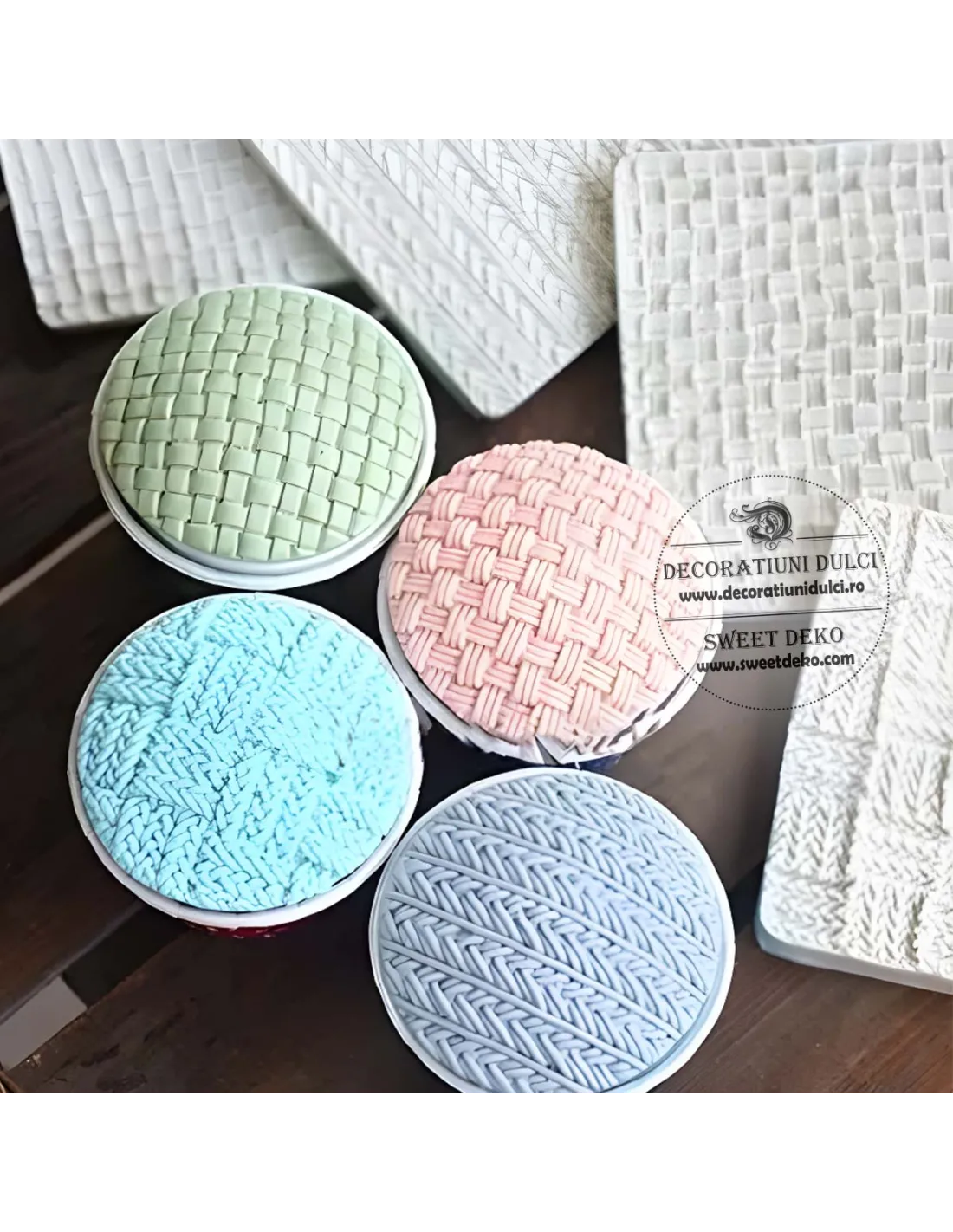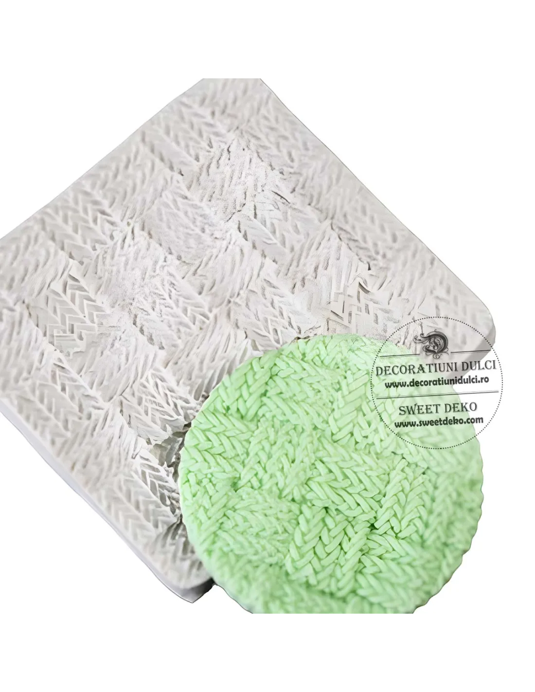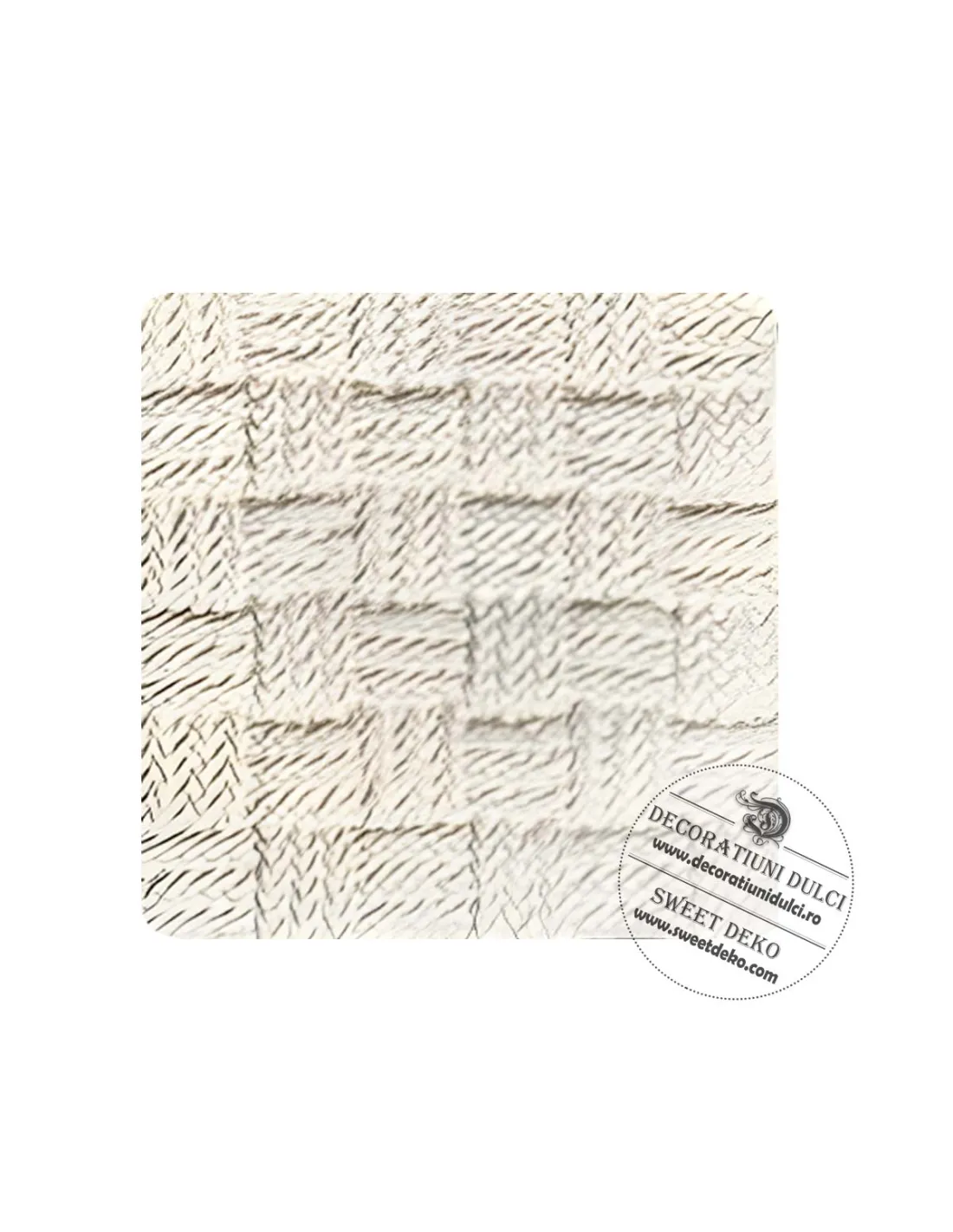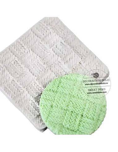 Mulajul este realizat din silicon si se poate imprima pe pasta modelatoare. Paste de zahar se intinde la grosimea dorita, se aseaza mulajul si se preseaza uniform cu ajutorul unei merdenele. Decorul obtinut va fi asemeneni unei tesaturi impletite.