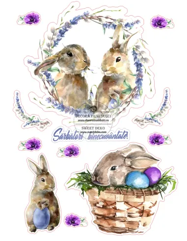 Imagini imprimate pe coala din pasta de zahar, pentru decorarea deserturilor dedicate sarbatorilor pascale. Mici iepurasi parca pictati, pe care ii puteti asorta cu alte decoruri tridimensionale pentru a obtine un design deosebit.