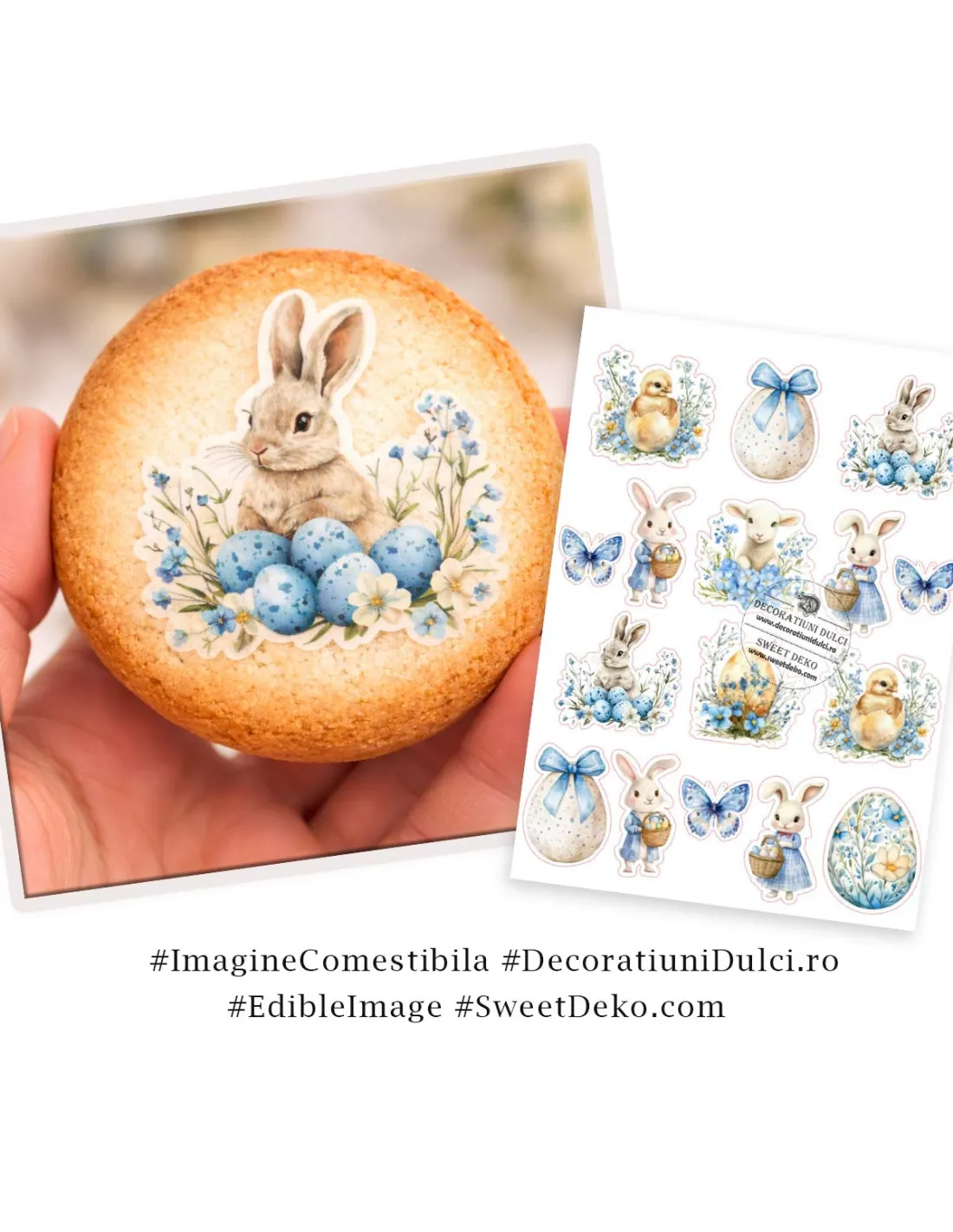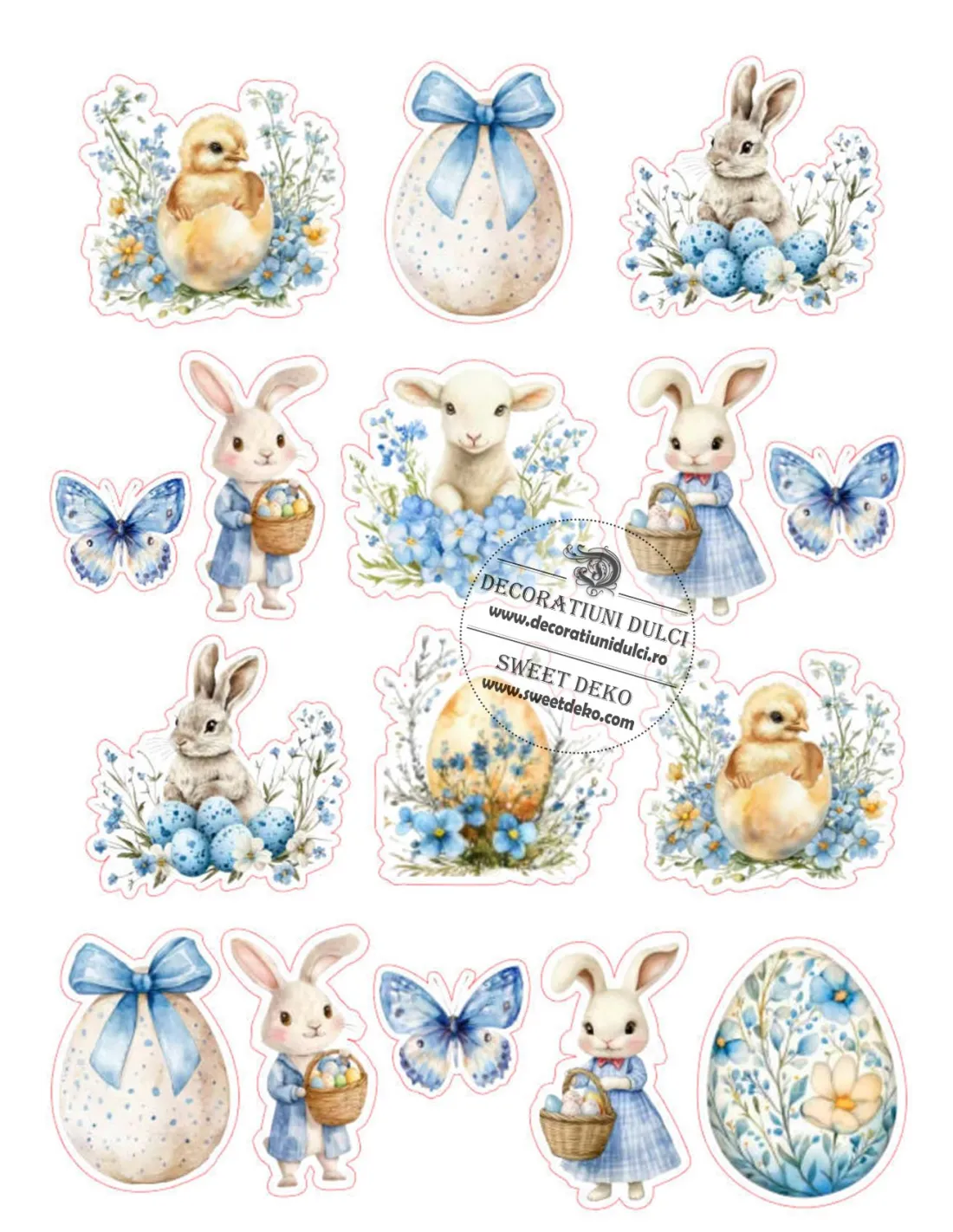 Un colaj cu imagini delicate in nuante de albastru, imprimate cu cerneala comestibila pe coala dulce si care vor fi perfecte pentru decorarea deserturilor de Paste.