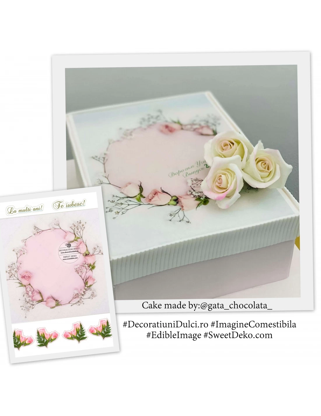 O imagine pentru un tort patrat, care se poate completa cu trandafiri roz. Proiectul a fost inspirat de un tort care semana cu o cutie de bomboane. Cele doua mesaje s e pot decupa si aseza in centrul coronitei de flori.