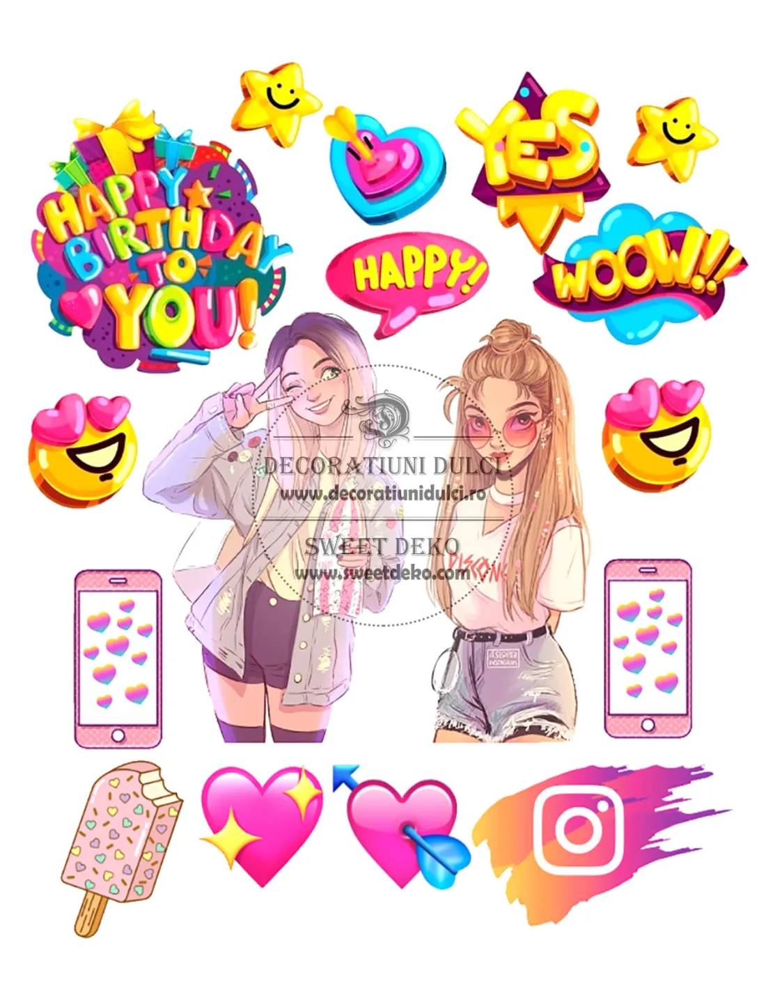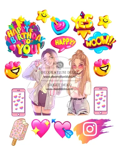 Imagine imprimata pe coala din pasta de zahar, Insta Story, cu poze asortate. Model utilizat pentru decorarea torturilor tematice. Imaginile pot fi completate cu decoruri tridimensionale precum flori din zahar sau naturale, fluturasi etc.