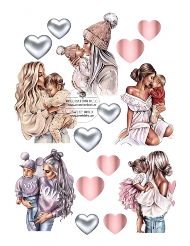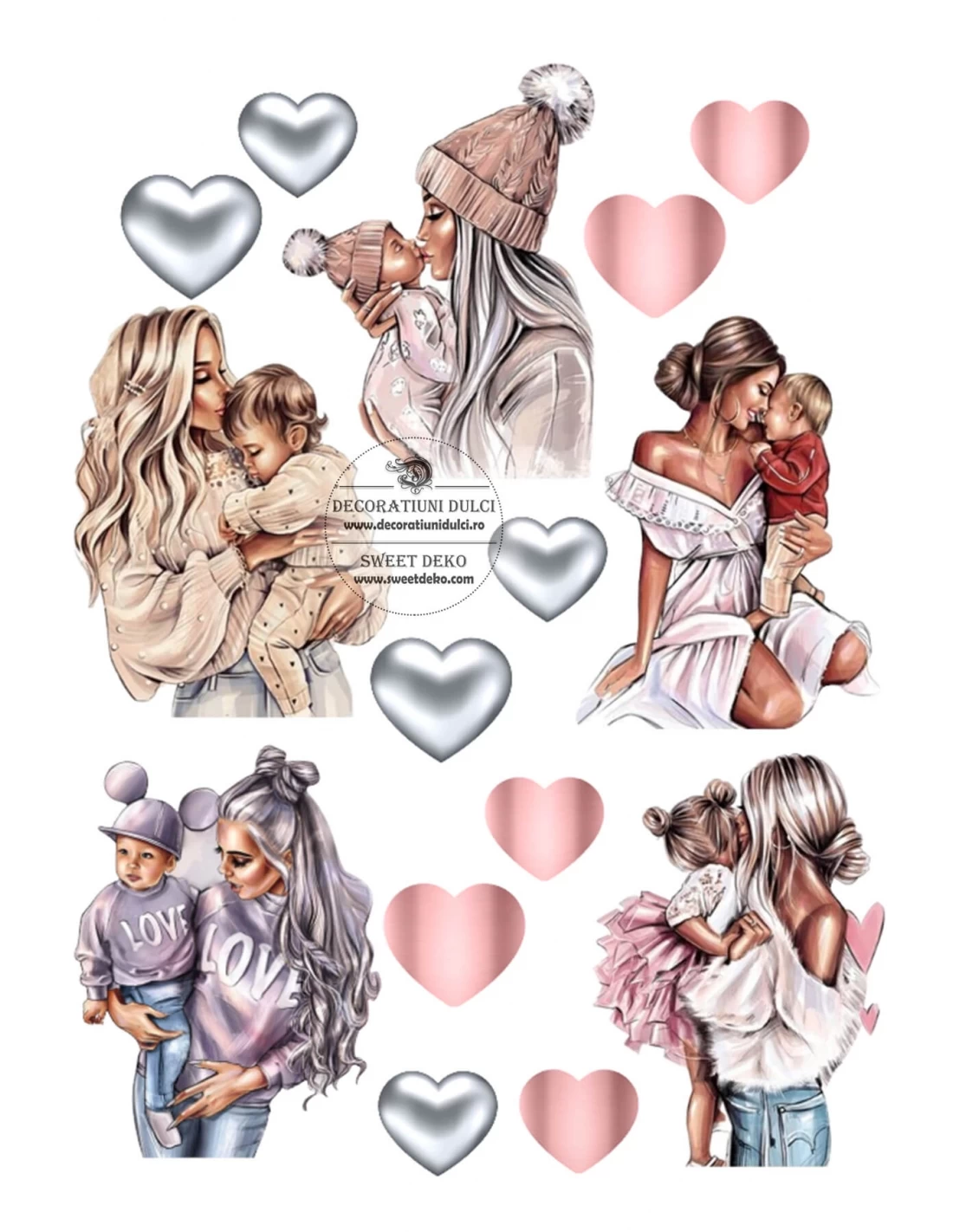 Imagini imprimate pe coala din pasta de zahar, pentru decoararea unui tort dedicat iubirii de mama. Decorurile se pot aplica pe un singur desert, sau puteti decora alaturi de alte elemente dulci sau flori mai multe torturi.