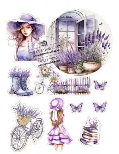 Un colaj cu imagini in nuante de lila, pentru decorarea torturilor dedicate iubitoarelor de lavanda. Adaugati elemente tridimensionale si decorul va fi minunat.