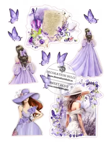 Un colaj cu imagini in nuante de lila, pentru decorarea torturilor dedicate tinerelor. Adaugati elemente tridimensionale si decorul va fi minunat.