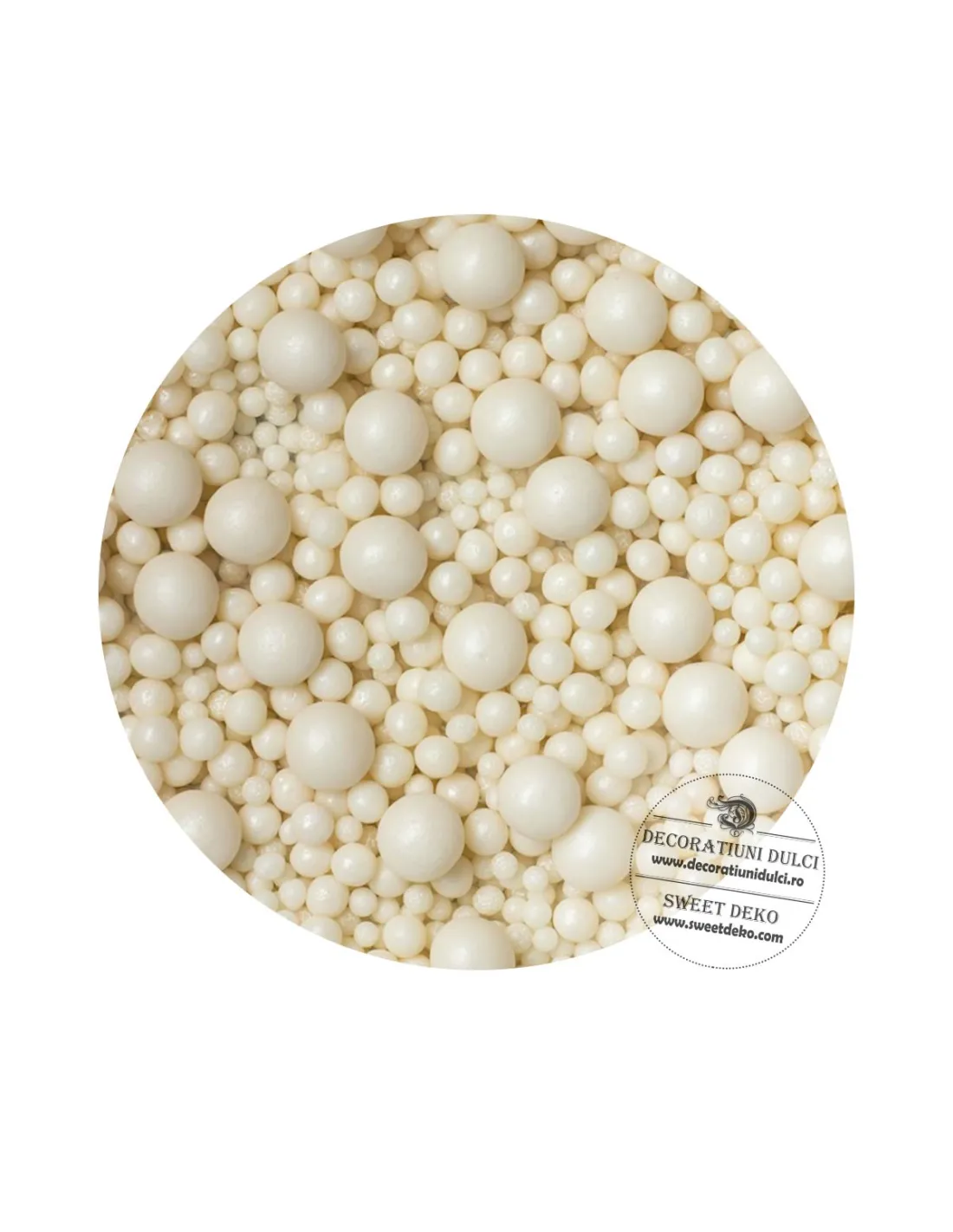 Perle din zahar in nuanta alba-ivory, disponibile in dimensiuni de 3, 5, 7 si 10 mm, ideale pentru decorarea torturilor, prajiturilor si deserturilor de cofetarie.