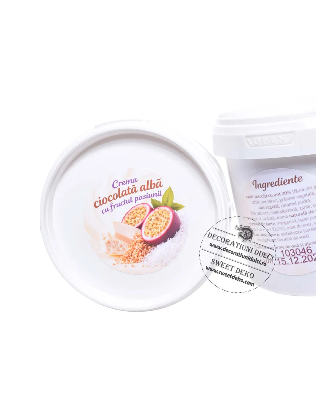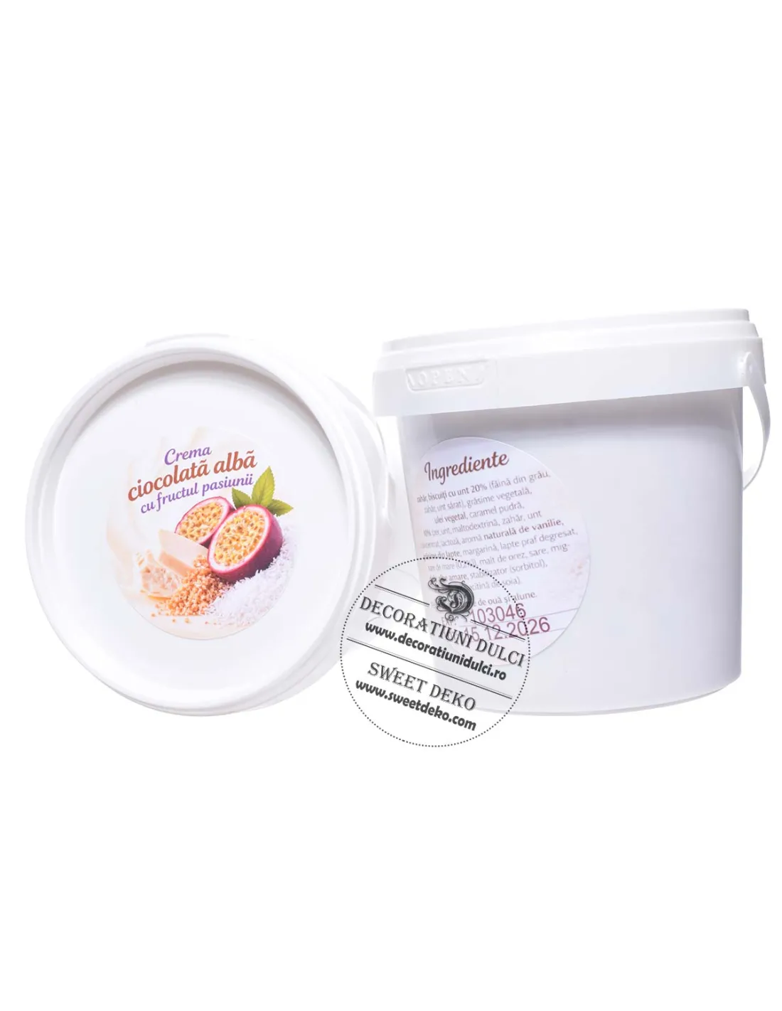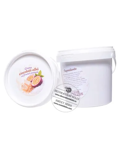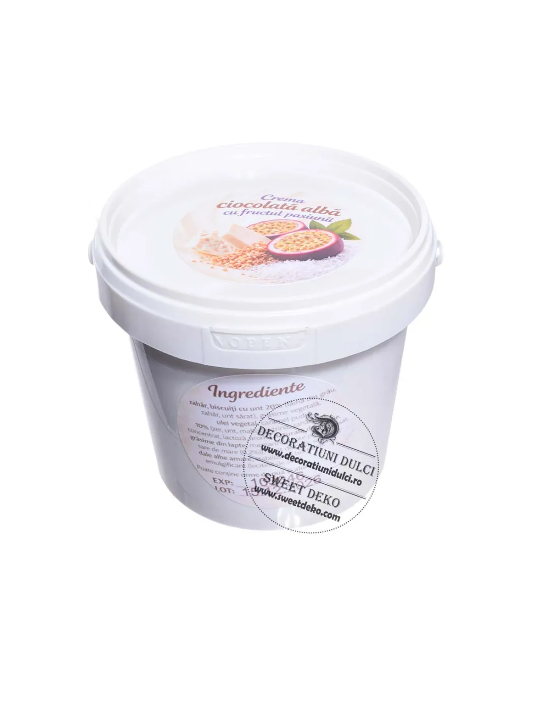 Produsul este o pralina crocanta pe baza de ciocolata alba cu unt de cacao, fructul pasiunii, cocos si biscuiti, gata de utilizat direct din ambalaj, fara nevoia de mixuri sau dozari complicate.