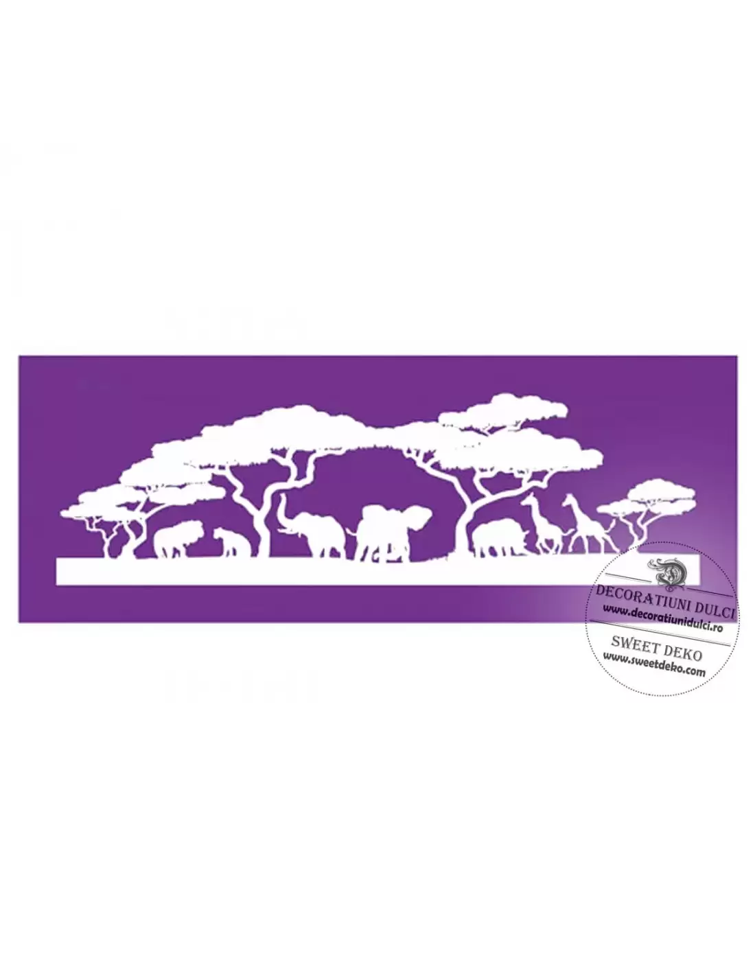 Sablon din matase pentru decor tort siluete savana. Produsul este recomandat a se fixa pe suprafata dorita si peste se aplica: vopsea alimentara, spray alimentar, un strat subtire de royal icing etc.
