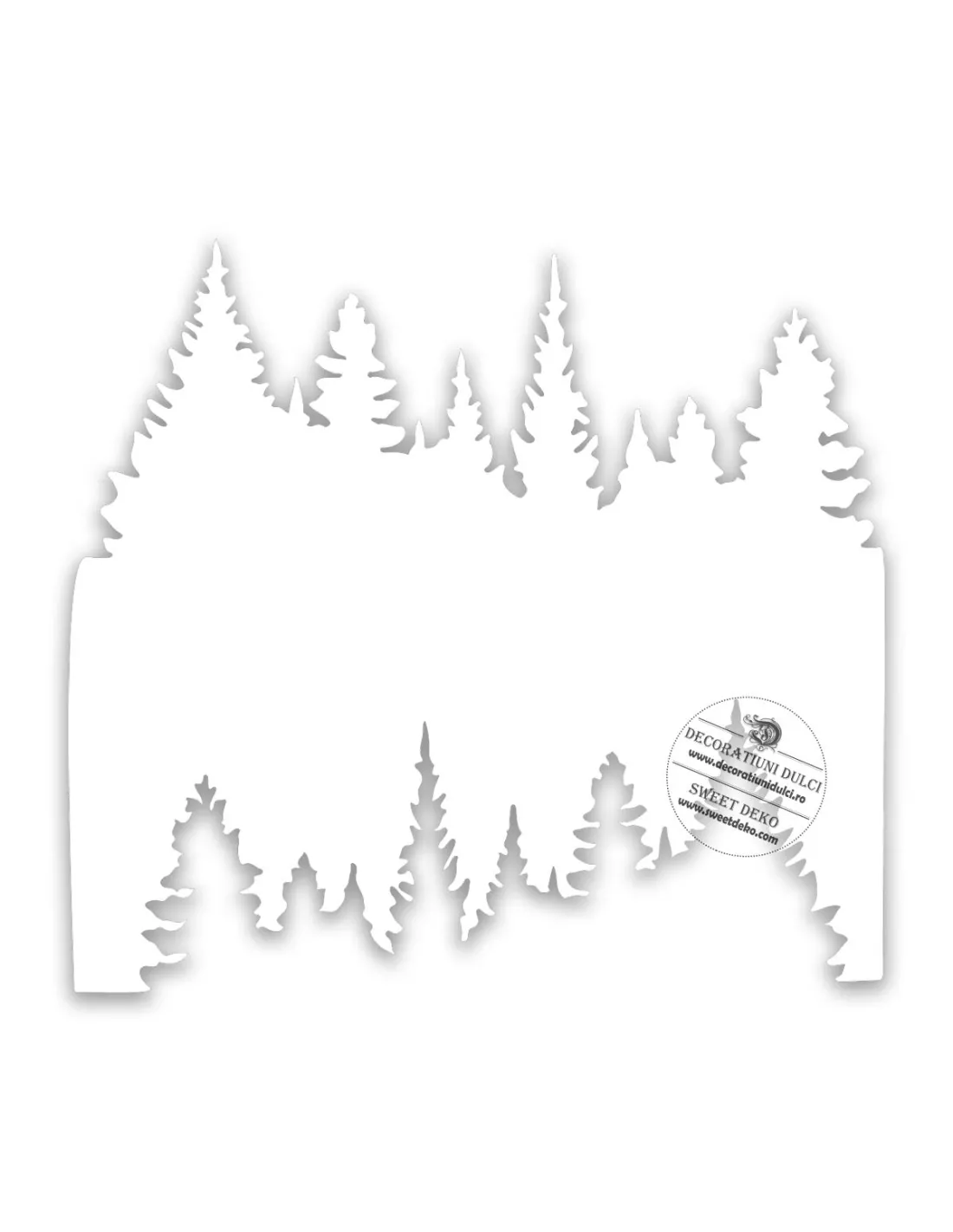 Stencil pentru tort cu model padure de brazi, realizat din material transparent, care permite pozitionarea foarte precisa pe suprafata tortului.