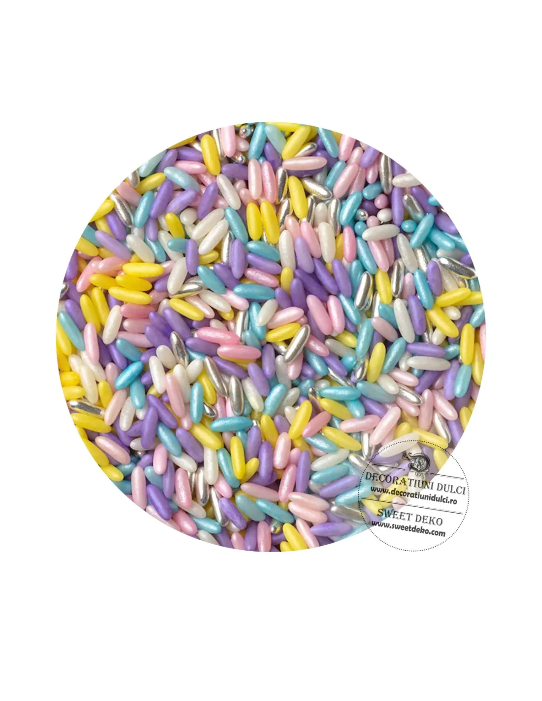 Decor din orez glazurat, in nuante de pastel, pentru diferite deserturi.