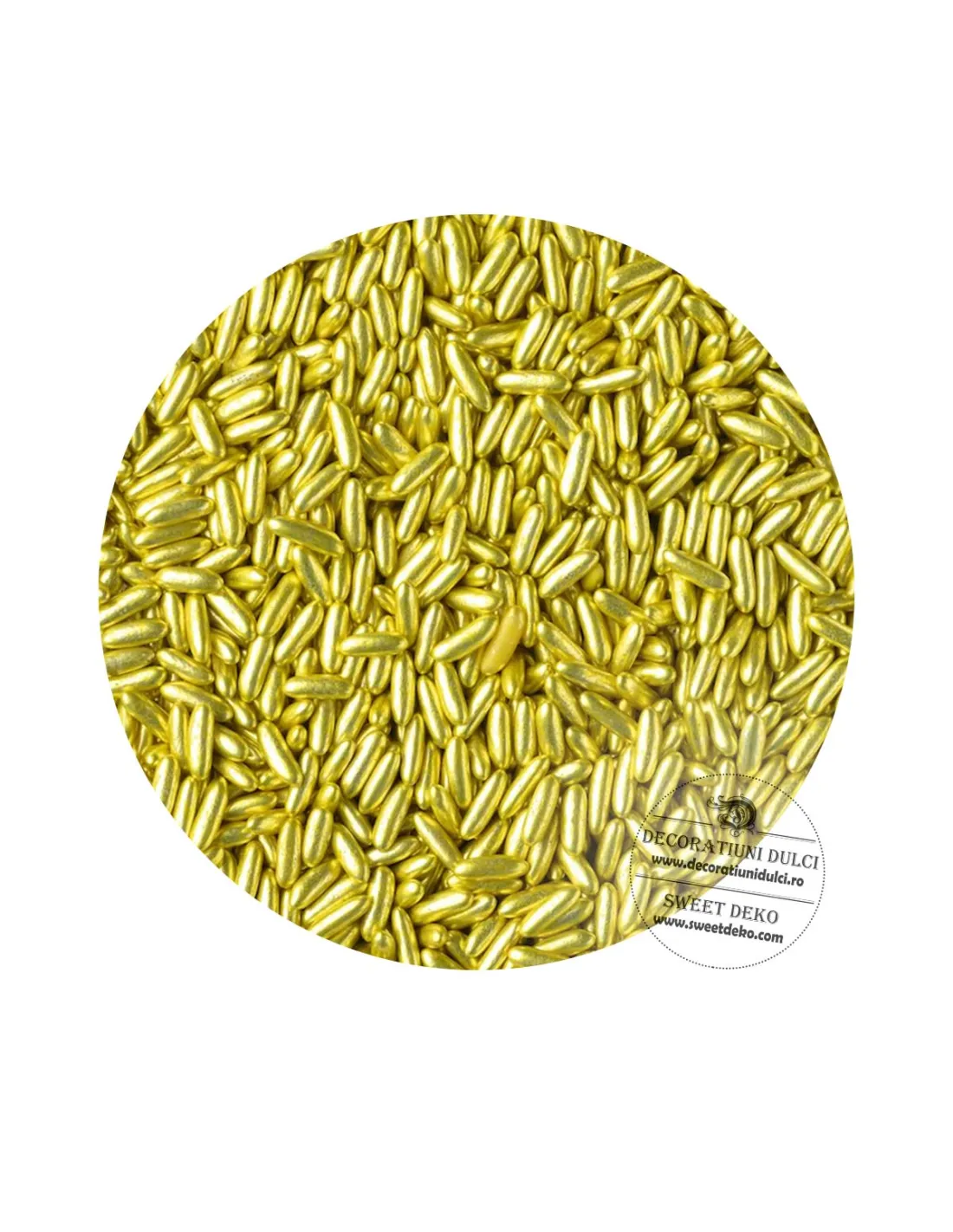Sprinkles din orez glazurat cu zahar, cu forma alungita si finisaj metalizat in nuante de auriu cu tenta olive.