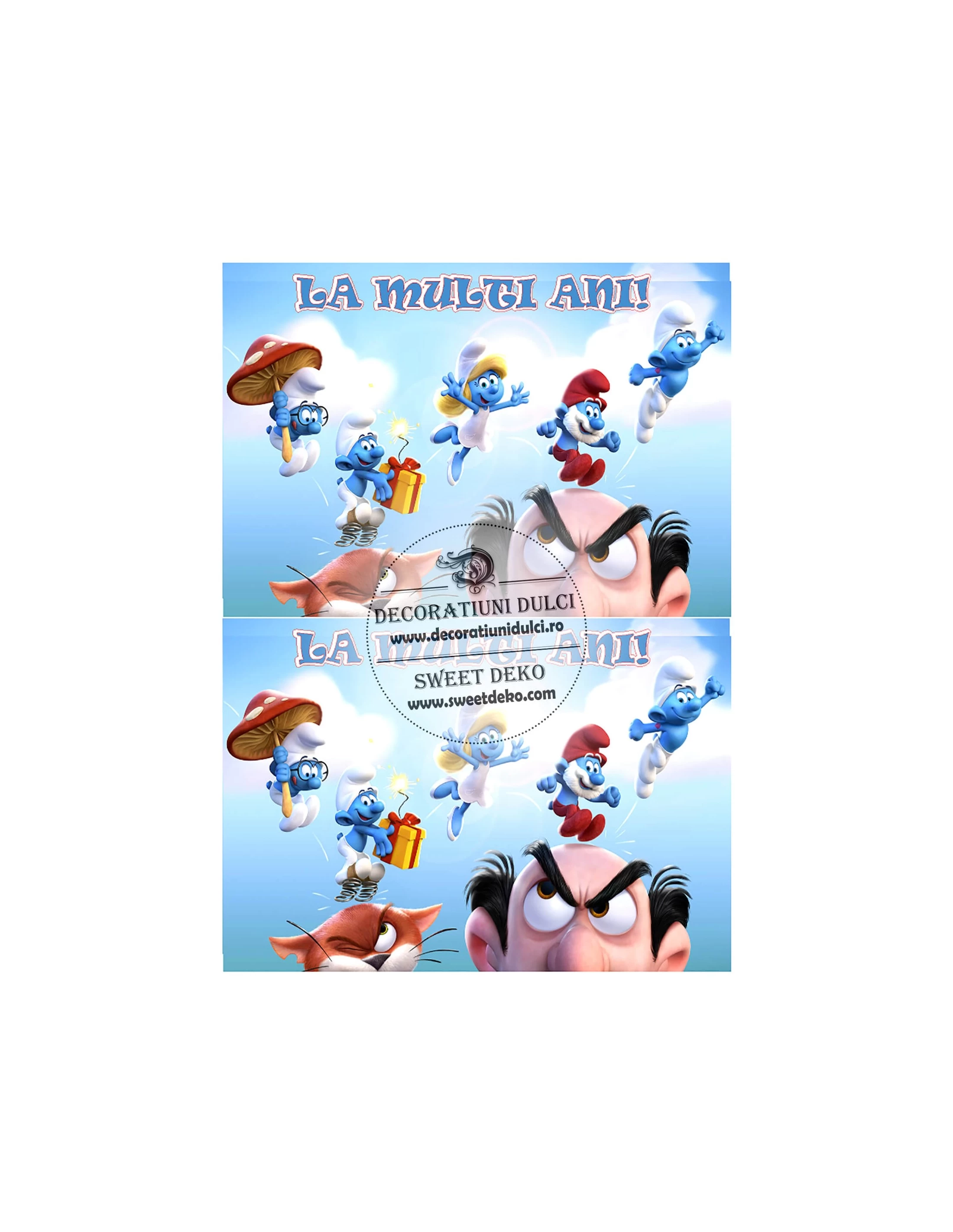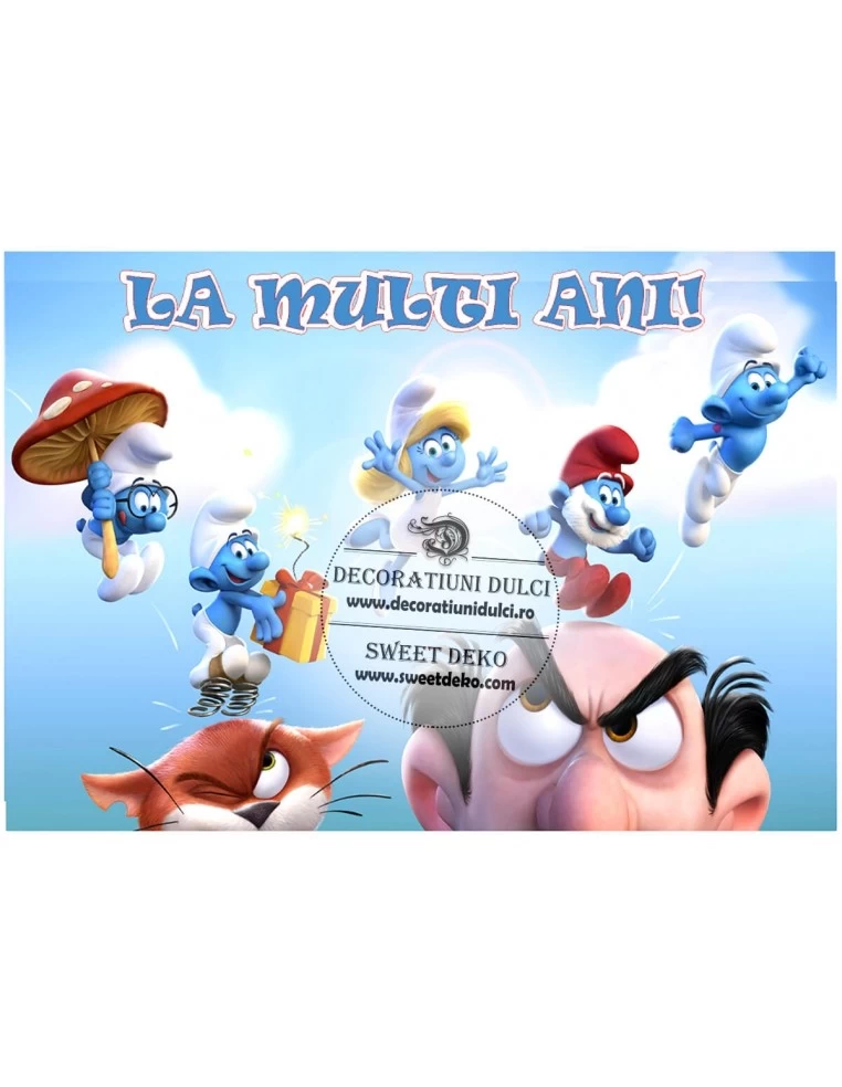 Imagine pentru tort ZBORUL STRUMFILOR! si tortul tau va fi imediat decorat. Coala poate fi asezata pe orice material de acoperit: fondant, martipan, frisca vegetala, crema de unt, creme tip oglinda (NU frisca naturala). Pentru torturile mai mici alege varianta A5, astfel poza pentru tort se va incadra perfect.