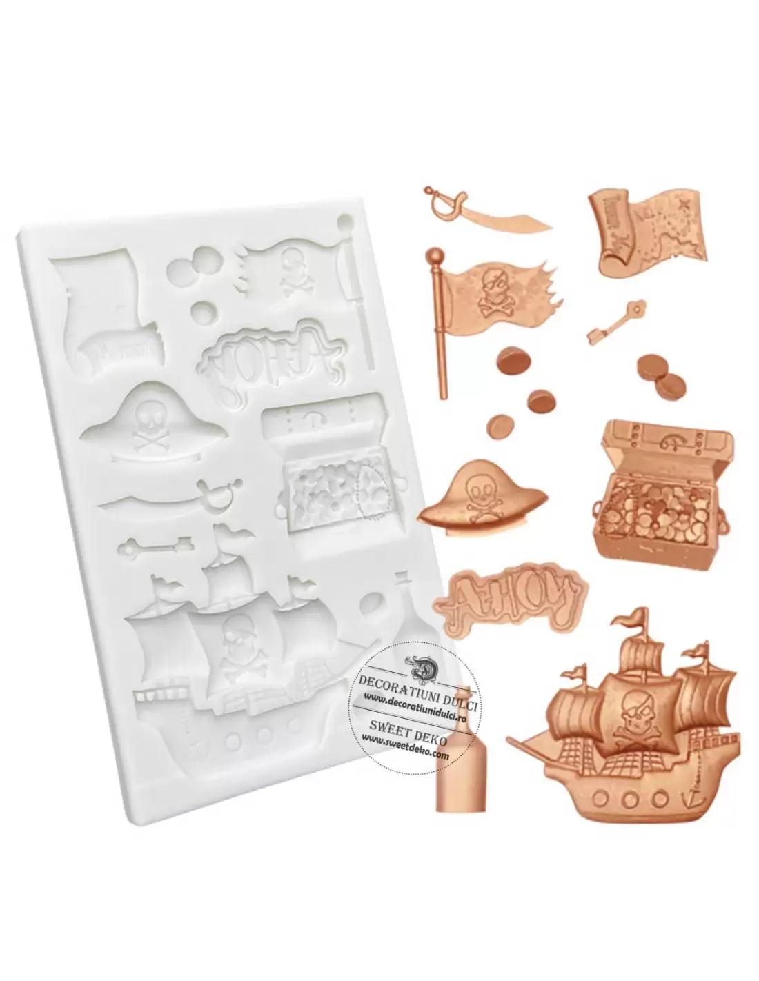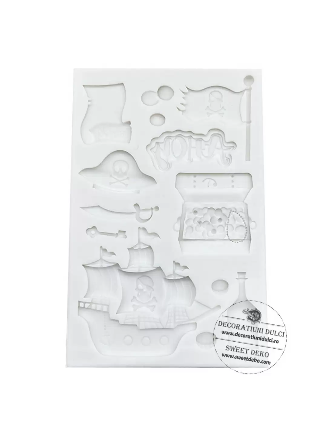 Mulaj forme de pirati o matrita cu ajutorul caruia puteti decora diferite deserturi pentru petrecerile cu pirati. Formele se pot realiza din pasta de zahar, ciocolata modleabile, sticla pentru mesaje o puteti crea din izomalt. Decorul este garantat a fi reusit cu ajutorul acestui mulaj.