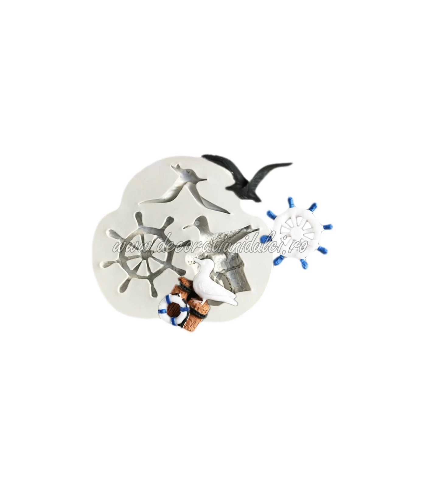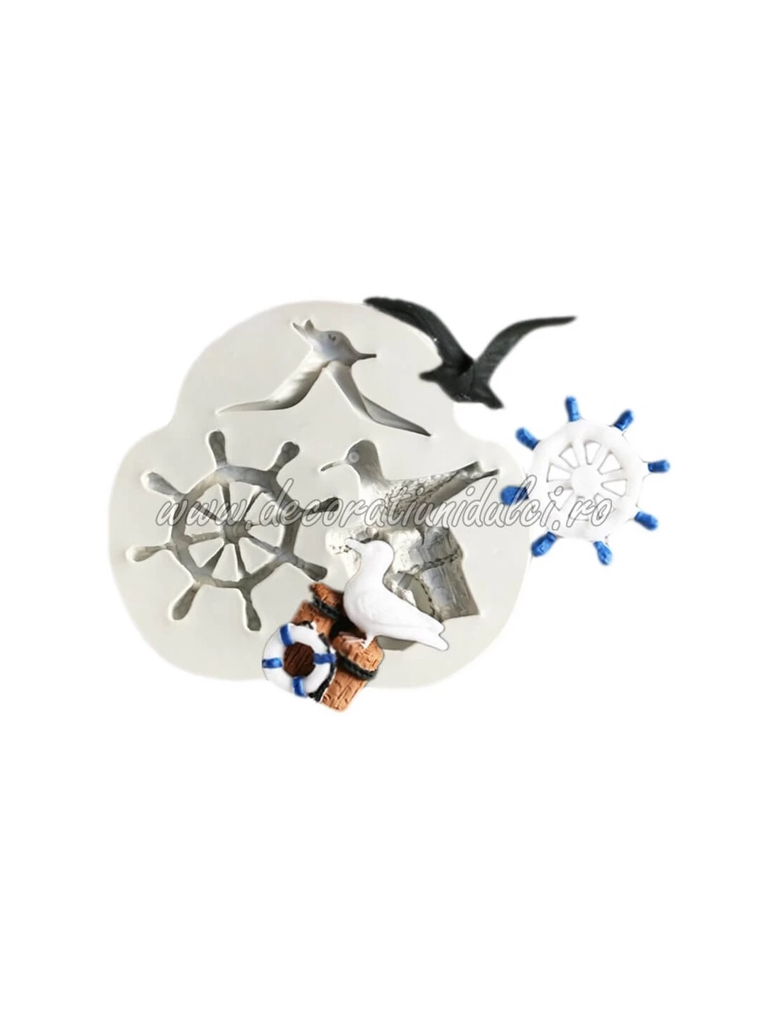 Mulaj din silicon alimentar petru deserturile cu tema marina, cu pescarus, carma si pasare in zbor. Perfect pentru completarea decorurilor de pe torturile cu tema marina sau a brioselor. Matrita poate fi utilizata si pentru lut polimeric (Fimo etc) insa se recomanda sa nu se utilizeze ulterior pentru materile comestibile.