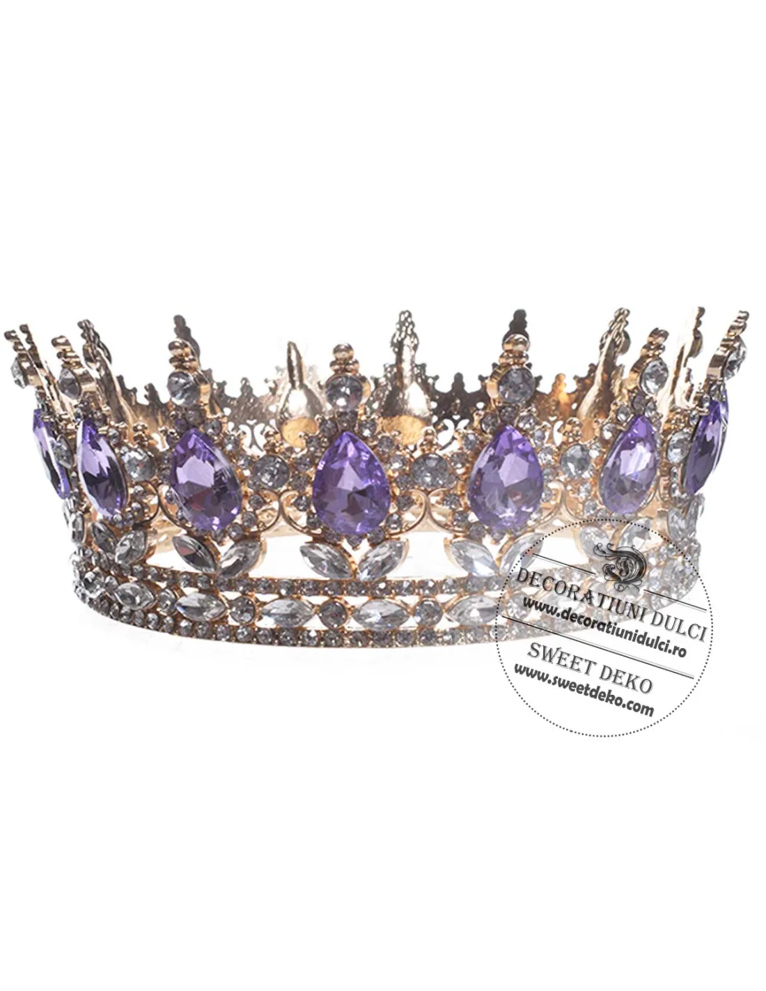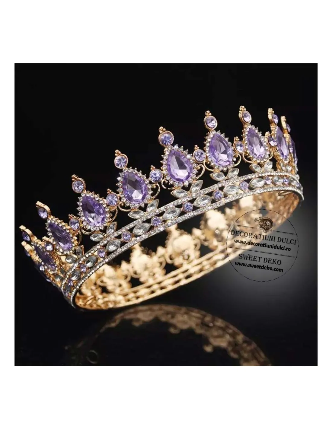 Coronita metaliza aurie decorata cu pietricele lila (mov deschis) si cristale transparente, pentru cele mai in tred deserturi de printese.