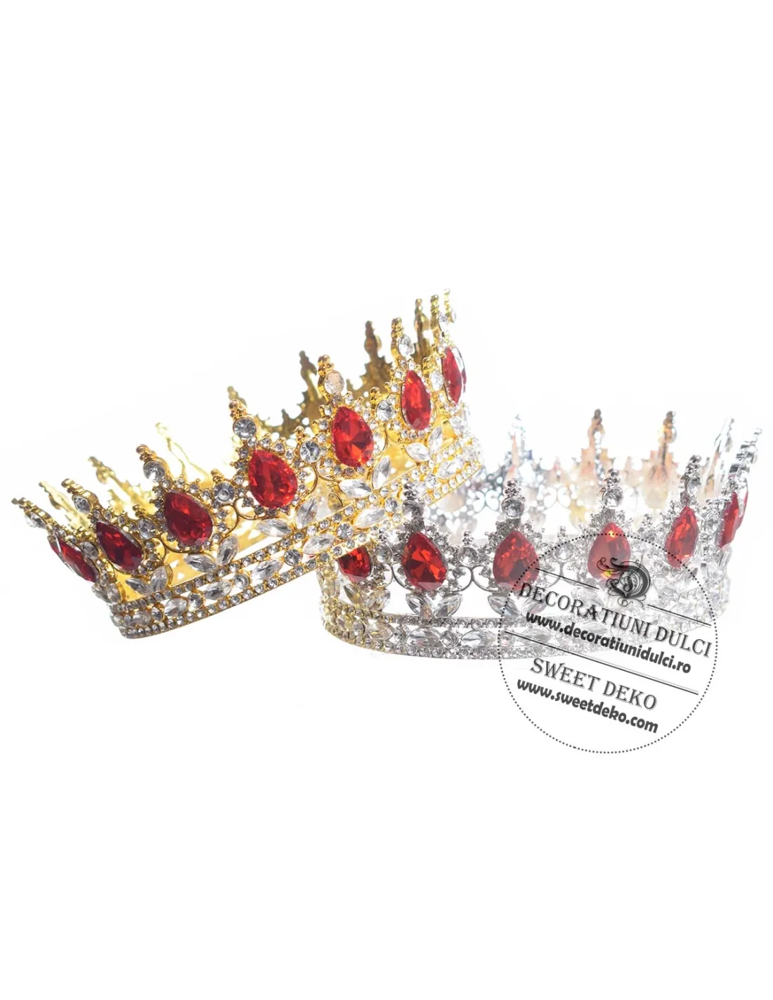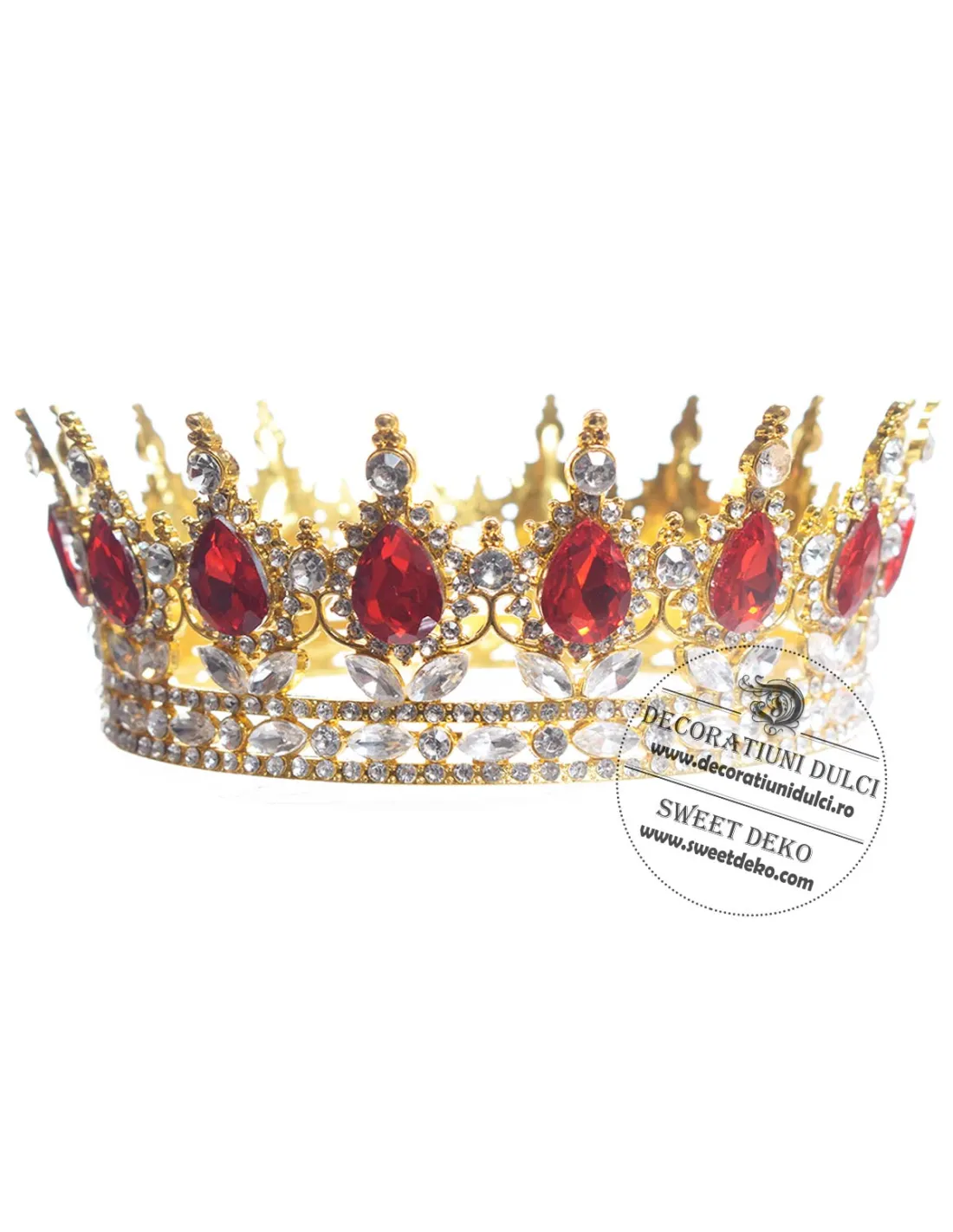 Coroniță metalică aurie, decorată cu pietricele roșii strălucitoare – un detaliu rafinat ce adaugă un strop de regalitate oricărui moment special. Poate fi pastrata amintire dupa eveniment, iar orice fetita sa se simta printesa si dupa petrecerea aniversara.