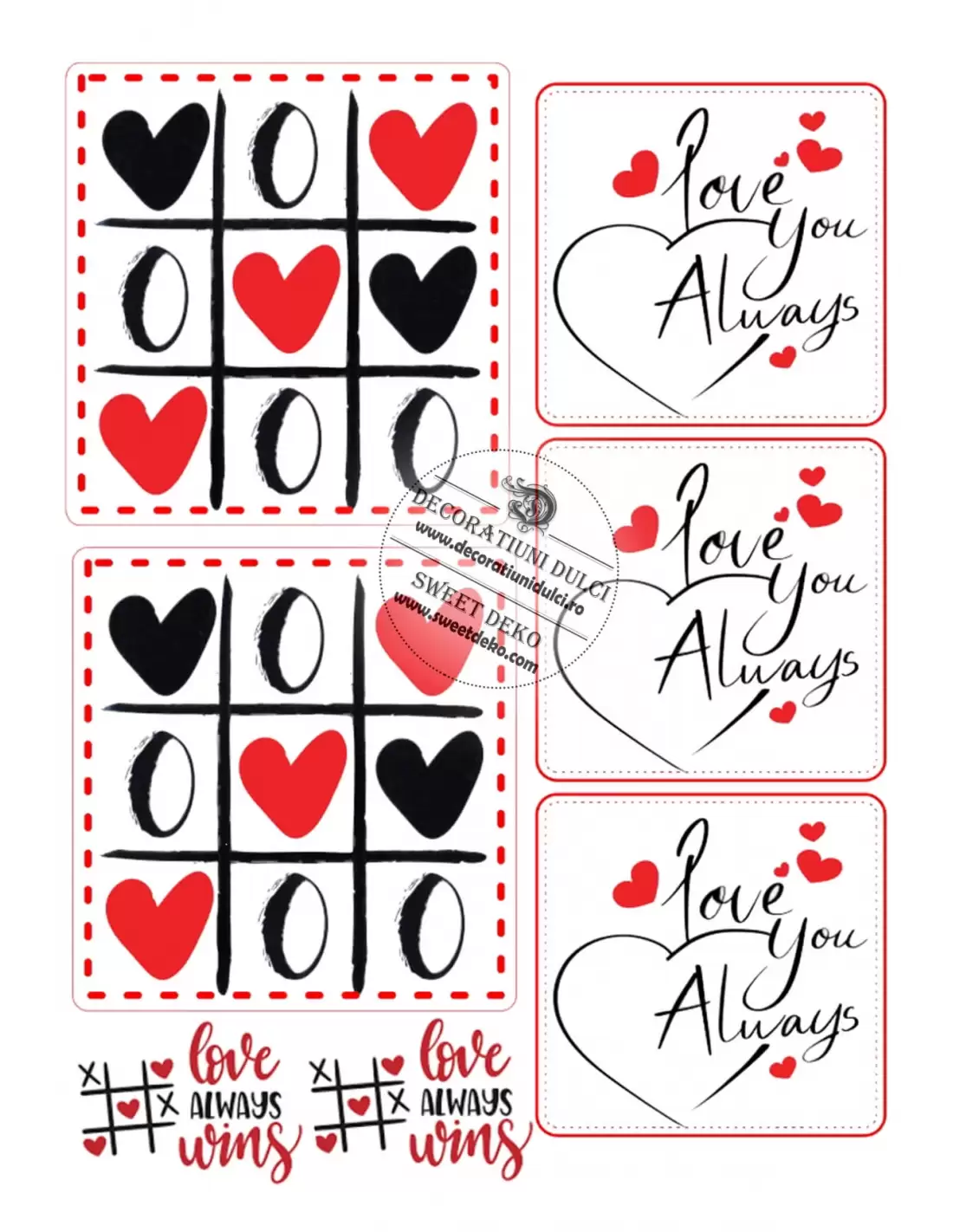 Imagine imprimata pe coala comestibila, sau foi de transfer pentru ciocolata, pentru decorarea deserturilor cu mesaje de iubire. Careul este potrivit pentru a se imbina cu mulajul Micro Love Silikomart asemeni proiectului din colaj.